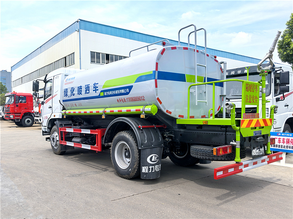 上裝配置:罐體采用國標Q235碳鋼,罐體厚度4mm,前后封頭5MM加厚型,罐體實際容積12立方(12噸),產品質量成熟可靠,設計先進合理,比同類灑水泵壓力大、吸程遠、使用壽命長,可泵進泵出。前沖、后灑、側噴,消防栓接口,帶后工作平臺及綠化高炮(可全方位旋轉,可連續調成直沖狀、大雨、小雨、毛毛雨),水位計,兩根等長輸水管,其余標配。 |