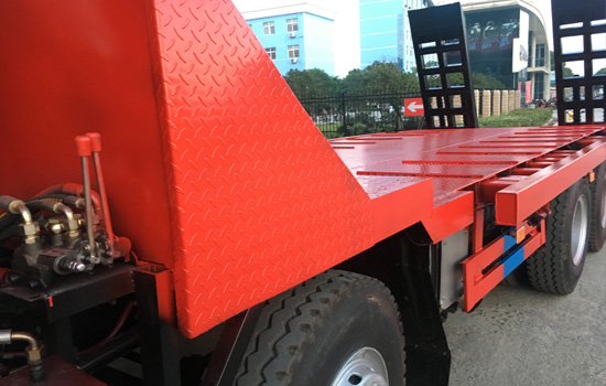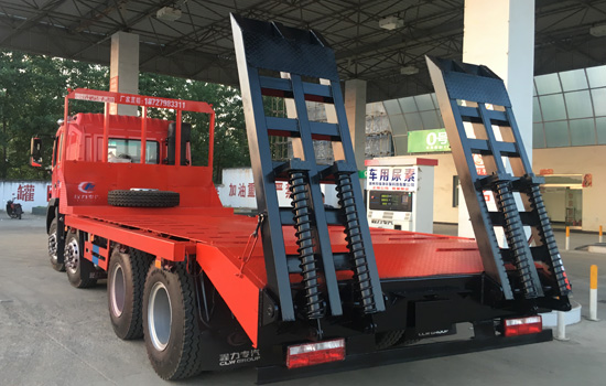 上裝配置:平板底板橫梁采用120*120*5mm方管,底板采用8mm、10mm或12mm花紋板(三種可選),帶加密斜支撐,爬梯采用雙彈簧加強型設計,采用三道筋+雙彈簧加固焊接,可選裝液壓爬梯或折疊加長型液壓爬梯,斜坡處帶后支腿,平板有效板長7.3米/8米兩種可選(含斜坡),寬2.5米(可手動伸展至3.2米),可以選擇貨箱帶欄板設計,36噸及以下噸位挖機首選車型!